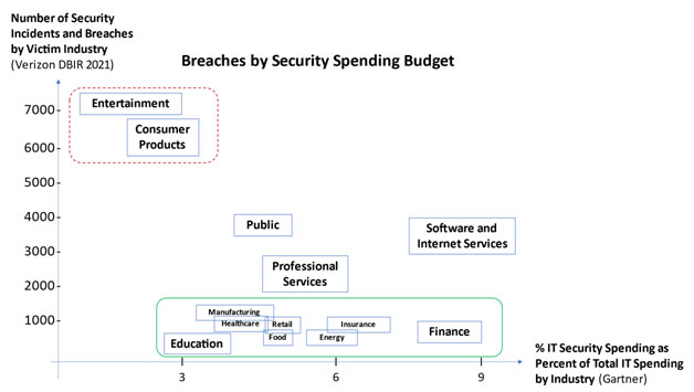Is there a correlation between the number of breaches, data leaks, and the security spending budget? Entertainment, consumer products, technology (software and internet services), and the public are upper parts. Finance is in the bottom part: